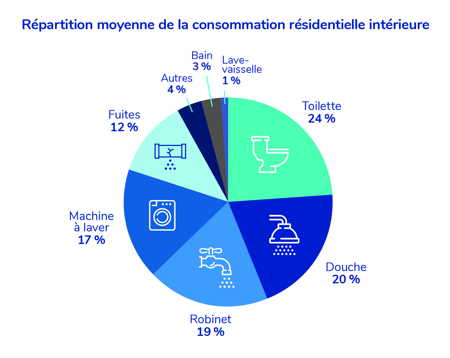 526 litres ! C’est la quantité d’eau potable totale fournie par les services publics chaque jour pour chaque Québécois en 2017[1]. Cette consommation, qui comprend les besoins en eaux des secteurs industriels, commerciaux et résidentiels, s’élève à près de 20 % de plus que la moyenne canadienne et à deux fois celle des Européens. À la maison plus spécifiquement, ce sont 240 litres d’eau potable qui sont utilisés chaque jour par chacun d’entre nous. (Possibilité de faire un lien avec illustration 2) Source de nombreux gaspillages, le bain et la douche représentent d’ailleurs la plus grande utilisation d’eau dans une habitation suivi de près par l’usage des toilettes. Pourtant, plusieurs gestes simples permettent de limiter ces pertes d’eau potable. Alors pour en savoir plus sur les réductions possibles de votre consommation en eau dans la salle de bain, suivez le guide.