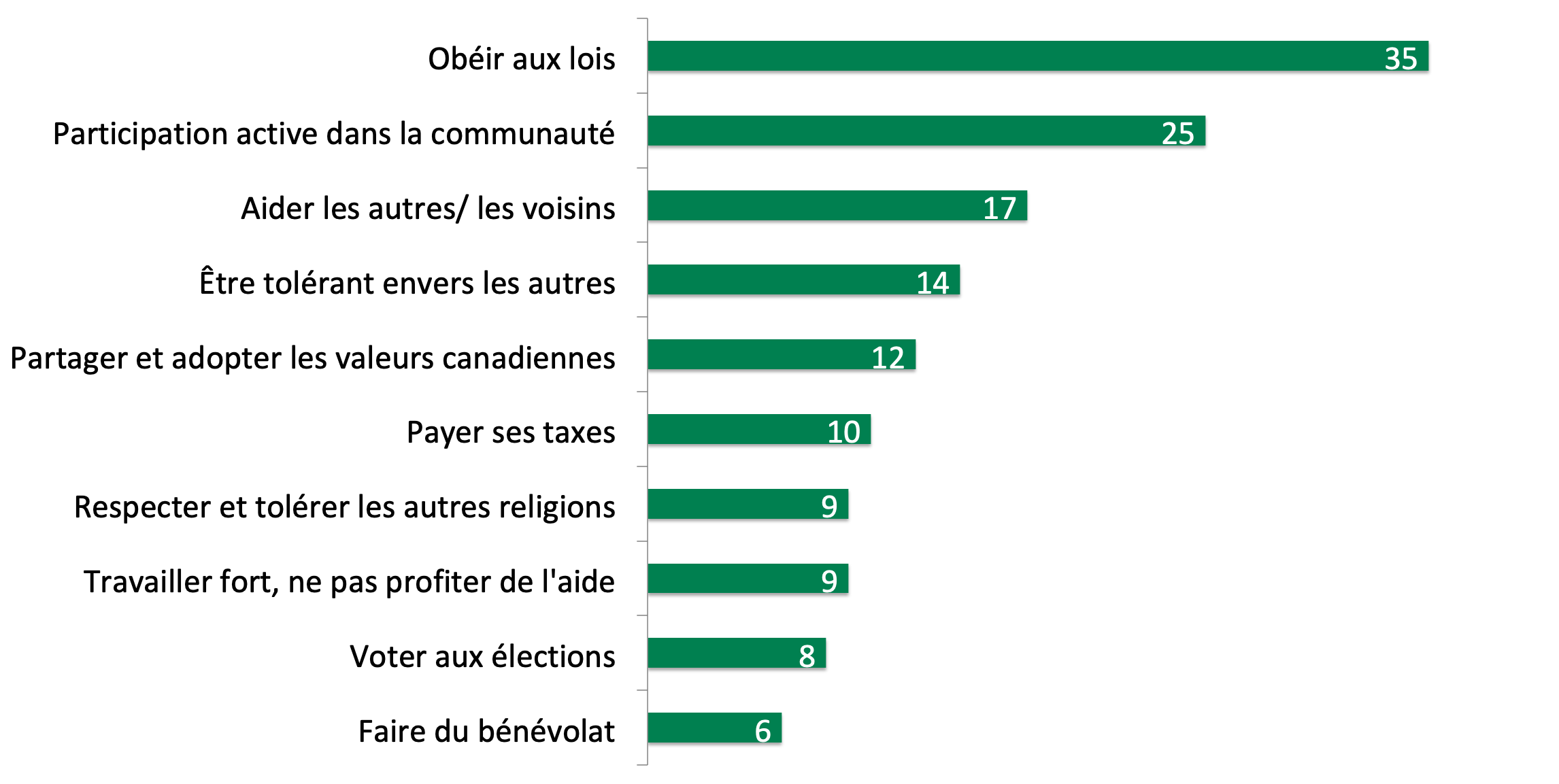 Selon les résultats de cette étude, on comprend rapidement que l’implication sociale est au cœur de la citoyenneté. Que ce soit en participant dans la communauté, en aidant les autres, en faisant preuve de tolérance et d’empathie, ou en faisant du bénévolat, les Canadien.ne.s et les Québécois.es considèrent qu’un bon citoyen est d’abord un être social.
