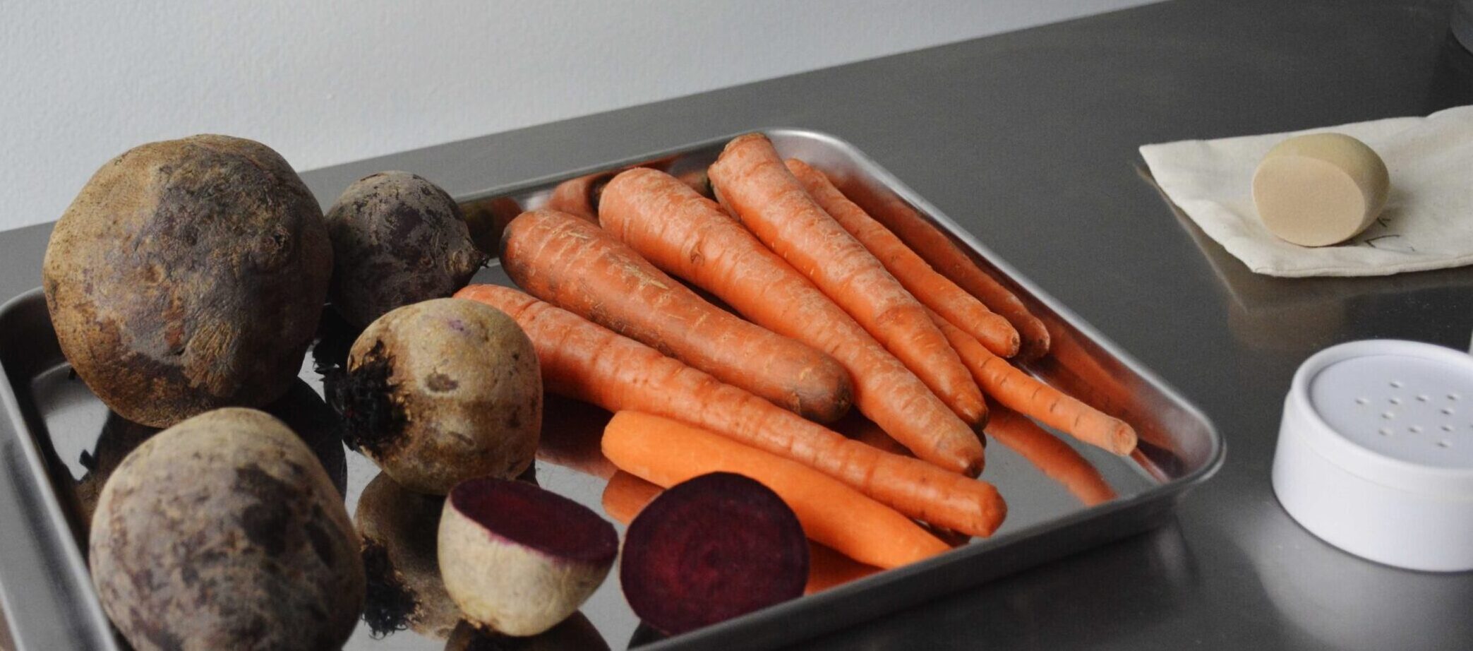 J’ai accès à des fruits et légumes biologiques invendus, grâce à mon partenariat avec le Projet Zéro Déchet. Les épinards, les carottes et les betteraves constituent la base de mes matières premières, essentielles à la fabrication de mes produits. Plus les aliments sont mûrs, plus les pigments seront intenses, ce qui est idéal pour mon travail. Lorsque je les reçois, je les nettoie soigneusement avant de procéder à l’extraction des pigments. Le processus comprend plusieurs étapes, qui varient selon le résultat que je veux obtenir.